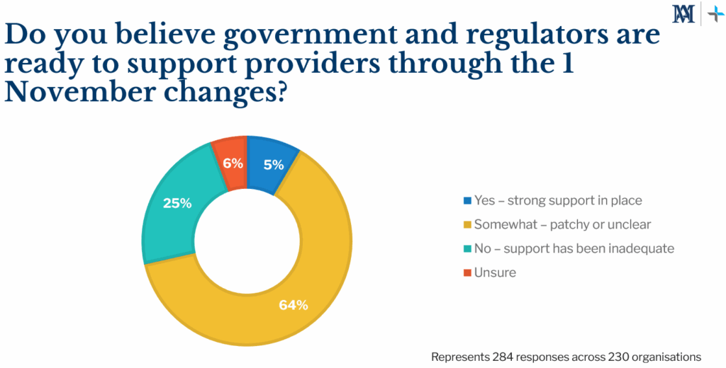 Only 5% of respondents believe government and regulators are strongly ready to support providers through the transition. 64% said support is somewhat in place but patchy or unclear, while a quarter of respondents felt support has been inadequate.