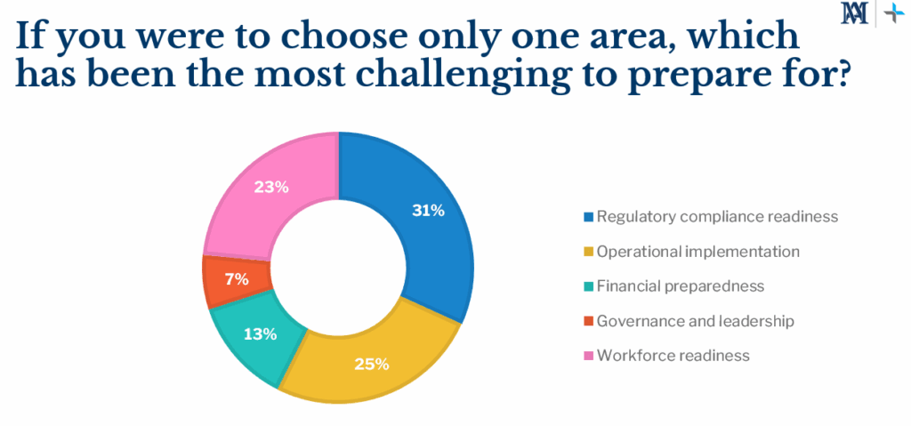 When asked to nominate the single most challenging area to prepare for, regulatory compliance readiness topped the list (31%), followed by operational implementation (25%) and workforce readiness (23%).