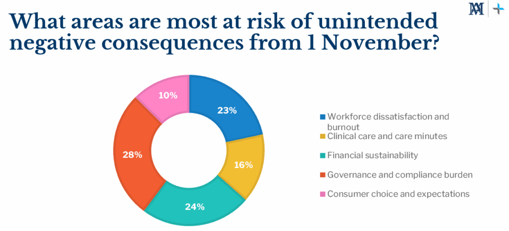 Respondents identified governance and compliance burden (28%), financial sustainability (24%), and workforce dissatisfaction and burnout (23%) as the top areas at risk of unintended negative consequences from the reforms. Clinical care and consumer expectations were also cited as potential pressure points.