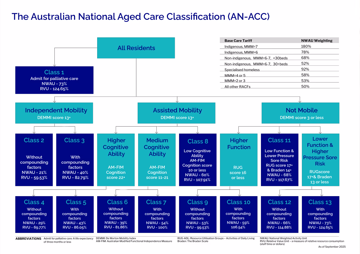 Resource utilisation studies have determined that the most significant cost drivers in residential aged care are admission for palliative care; frailty; mobility; activities of daily living; cognition, communication, and behaviour.