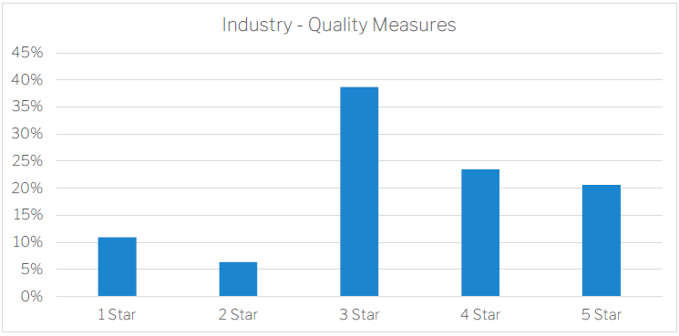 The QI in the Star Ratings show a much broader distribution. Calculated on benchmarking quintiles the distribution is shown below. In principle, the quality measures target aspects of health and wellbeing that are more likely to affect older people but can be minimised when good quality care is provided. This is a view that is sometimes debated as some of the QI can be subjective or competing with other policy requirements such as consumer choice (like the choice to move around unaided and potentially fall). The average rating for the industry is approximately 3.36 stars.