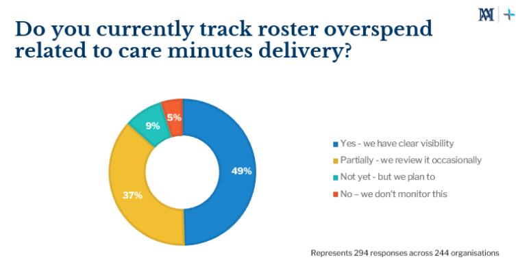 Workforce overspend is another area where visibility is improving, though there is still work to do. Nearly half (49%) of providers report clear oversight of roster overspend related to care minutes, while 37% only review this occasionally. A smaller group, 14%, are either just starting to monitor or don’t review overspend regularly.