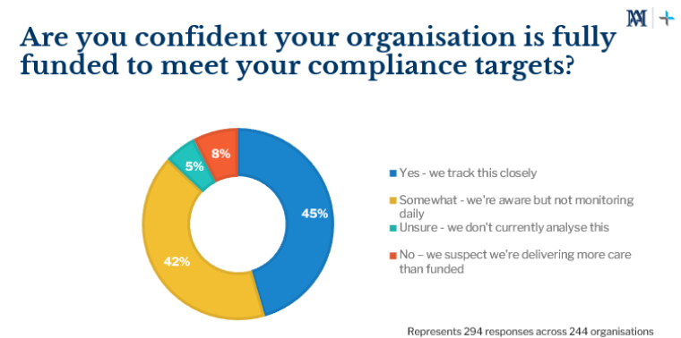 When asked about confidence in being fully funded to meet care minute compliance, only 45% of providers said yes, indicating close tracking. A further 42% said “somewhat,” suggesting awareness but limited day-to-day oversight. Notably, 13% acknowledged they either don’t analyse this regularly or believe they are delivering more care than funded for.