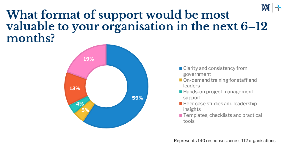 Looking ahead to the next 6 to 12 months, 59% of respondents said clarity and consistency from government would be the most valuable form of support. Practical resources—such as templates, checklists, and tools—were nominated by 19%, while 13% said leadership insights and peer case studies would be most helpful. The data points to a strong appetite for implementation support, with providers clearly indicating a preference for tools that enable action, not just information.