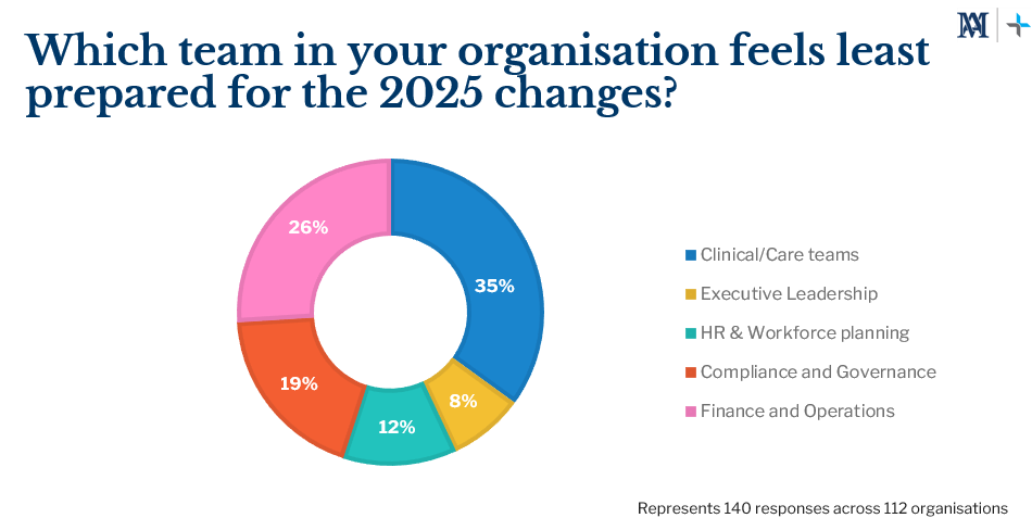 When asked which teams feel least prepared for the reforms, 35% of respondents identified clinical and care teams as the most underprepared. This was followed by finance and operations teams at 26%, compliance and governance teams at 19%, and HR and workforce planning at 12%. Only 8% of organisations said their executive leadership felt unprepared. This spread suggests that awareness of reform may be concentrated at the top, while the teams closest to day-to-day care delivery require more structured engagement and support.