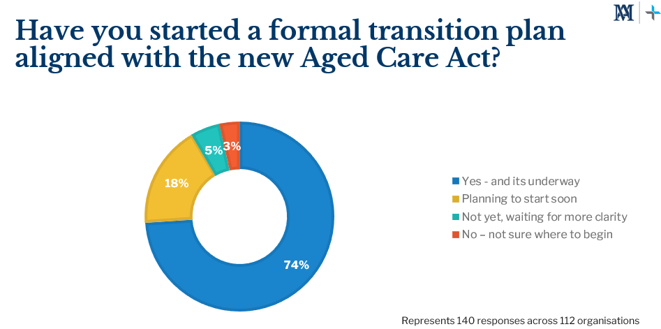 The majority of respondents indicated that transition planning is already underway. 74% percent said they had started a formal transition plan aligned to the new Aged Care Act, while 18% reported that planning would begin soon. A further 8% said they had not yet started or were unsure where to begin. While the majority are moving in the right direction, the data highlights a need to bring remaining organisations into action and ensure planning translates into execution.