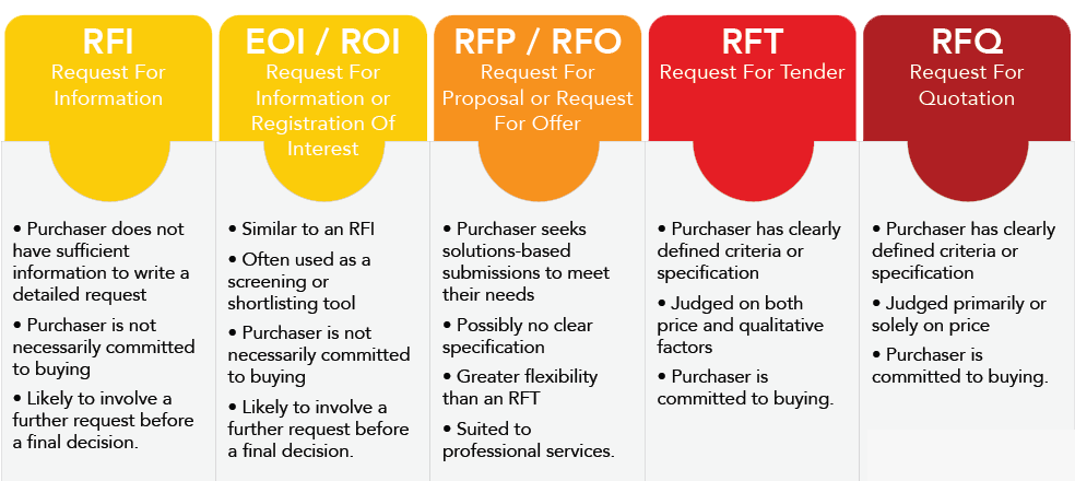 *This can soon become a disadvantage if a business is too prescriptive with a requirement and will depend on how they approach the tender (read about the differences between RFI, EOI, RFP, RFT and RFQ below).