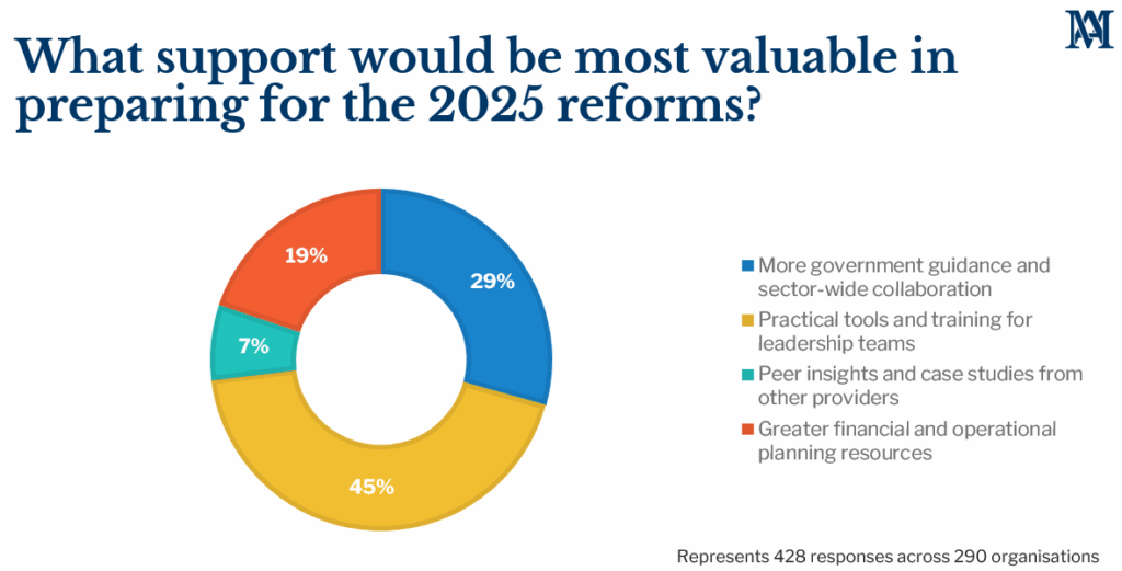 When asked what type of support would be most valuable in preparing for the 2025 reforms, nearly half of respondents (45%) indicated they need practical tools and training for leadership teams. A further 29% called for clearer government guidance and more collaboration across the sector. Nineteen percent identified a need for stronger financial and operational planning resources, while only 7% wanted peer insights or case studies. This strong leaning towards tangible, real-world solutions shows that providers are looking for more than policy updates—they want tools that help them make change happen on the ground.