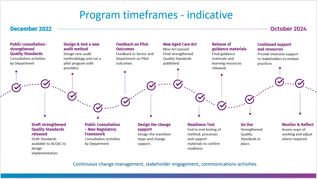 The DoHAC have an ambitious timeline, with the proposed single Go Live date planned for 1 July 2024. Therefore, it is important that providers continue to stay up to date with changes as they become available to the sector.