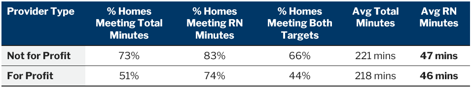 - Both targets: 1,055 homes (≈43%) meet both total and RN minutes on their own staffing highlighting where RN availability is a persistent challenge.