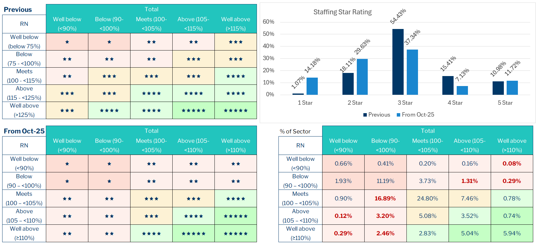 The updated Staffing ratings will be reflected in the second quarterly Star Ratings update of 2026, published on the My Aged Care website via the “Find a Provider” tool. While the ‘updated Staffing ratings’ will be reflected in the second quarterly update in 2026, the changes will come into effect from 1 October 2025. The second quarterly update in 2026 will reflect the data from the quarter 1 October to 31 December 2025.